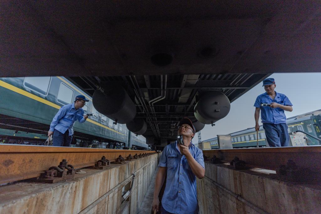 8月15日,重庆车辆段工作人员在重庆西客车整备所对入库车辆进行检修。