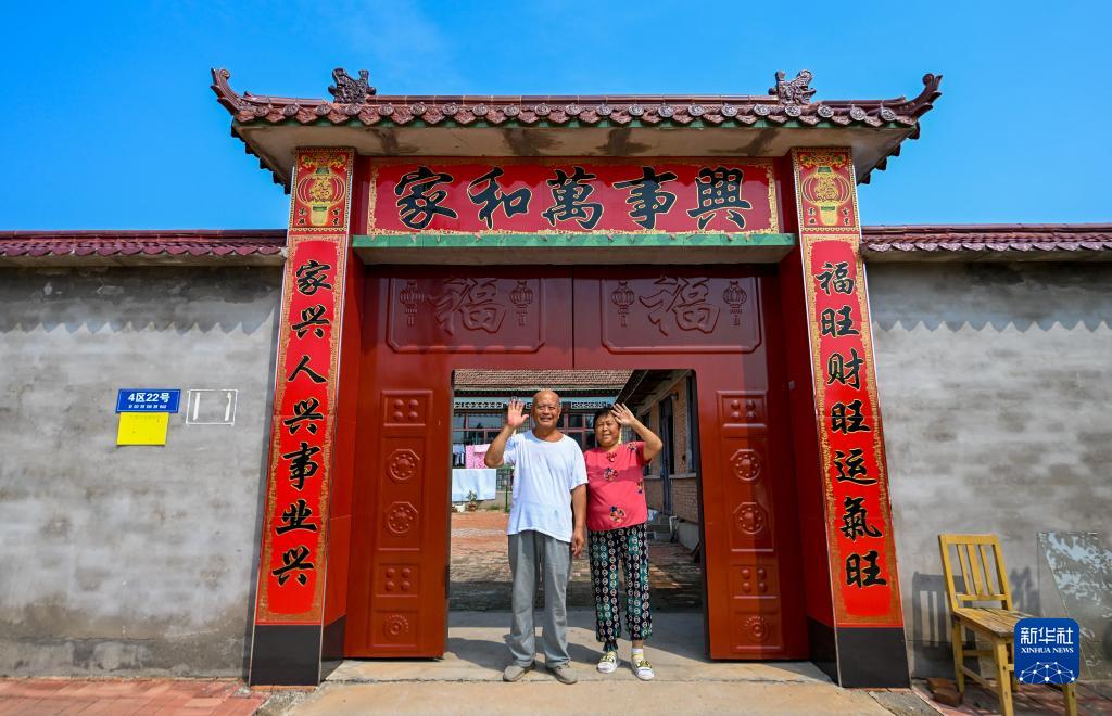 8月17日,在天津市武清区黄花店镇邵七堤村,一户返村村民在家门口向记者挥手致意。