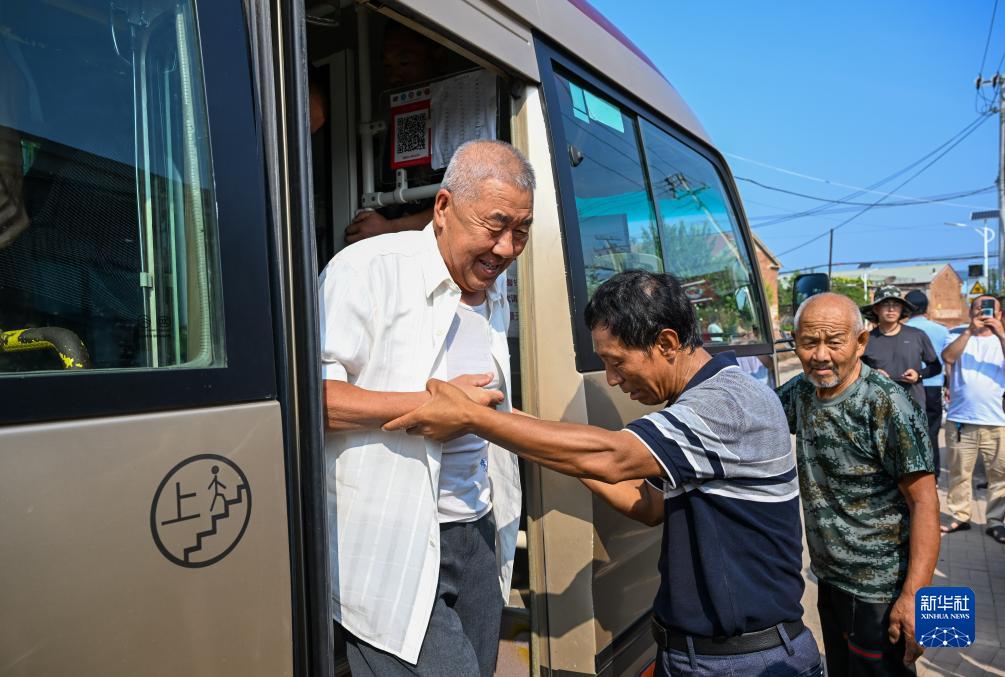 8月17日,在天津市武清区黄花店镇邵七堤村,村委会主任寇之明(左二)迎接村民回村。