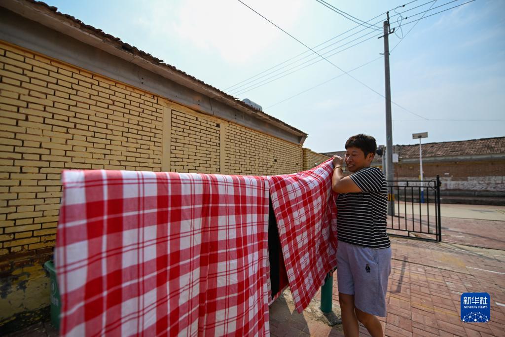 8月17日,天津市武清区黄花店镇邵七堤村村民回家后晾晒被褥。