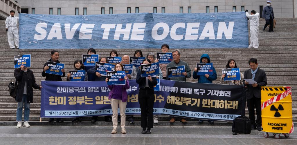 4月25日,在韩国首尔,民众手举标语抗议日本政府核污染水排海计划。新华社发(李相浩摄)