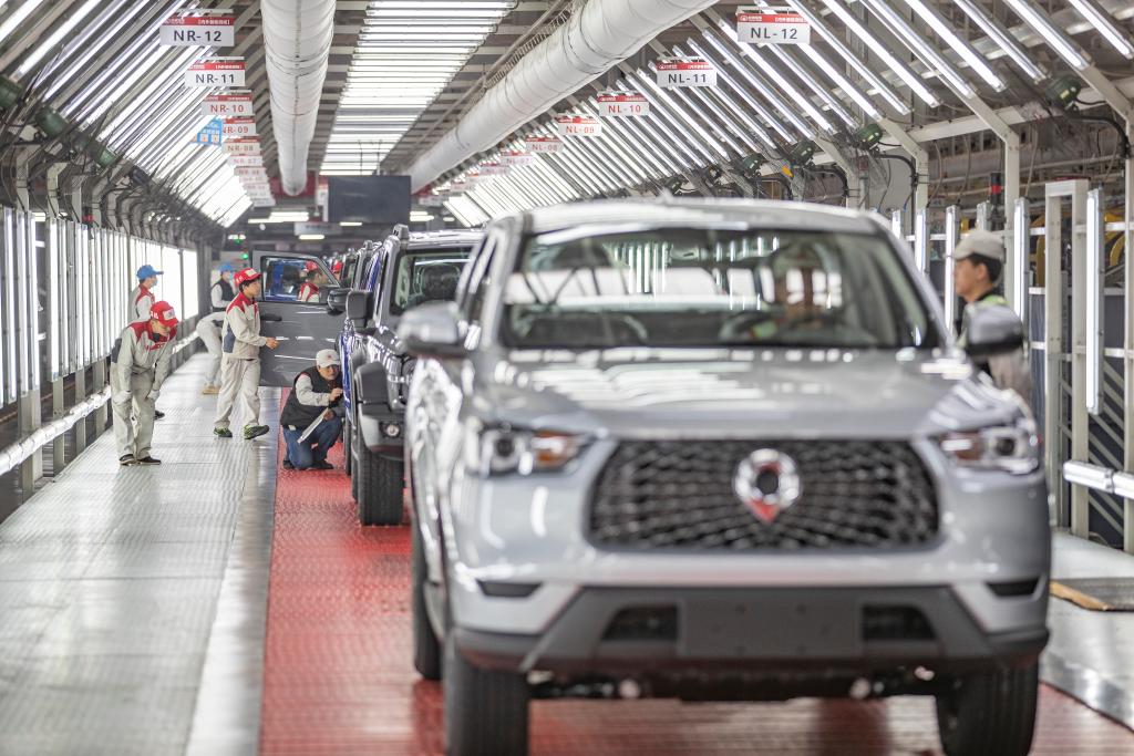 在长城汽车永川生产基地,总装车间检测线的员工对车辆进行下线前的检测。新华社记者黄伟 摄
