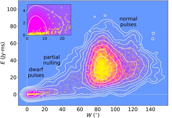 脉冲星B2111+46的矮脉冲在脉冲宽度和辐射能量方面与正常脉冲明显区隔。(中国科学院国家天文台供图)