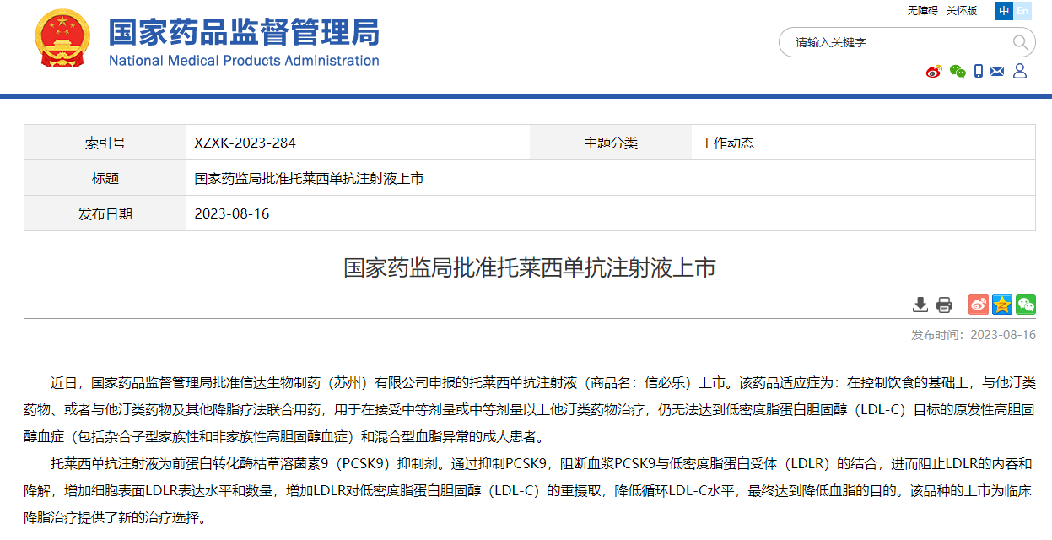 据了解,托莱西单抗注射液为前蛋白转化酶枯草溶菌素9(PCSK9)抑制剂。通过抑制PCSK9,阻断血浆PCSK9与低密度脂蛋白受体(LDLR)的结合,进而阻止LDLR的内吞和降解,增加细胞表面LDLR表达水平和数量,增加LDLR对低密度脂蛋白胆固醇(LDL-C)的重摄取,降低循环LDL-C水平,最终达到降低血脂的目的。该品种的上市为临床降脂治疗提供了新的治疗选择。根据信达生物此前披露的托莱西单抗三期临床研究结果,高胆固醇血症患者在使用托莱西单抗12周后,LDL-C水平显著下降,降幅达68.9%。