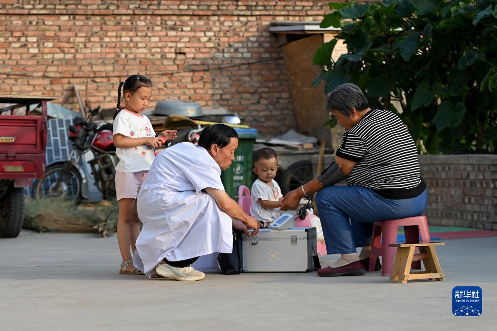 在石楼县龙交乡王家沟村,杨兴荣(左二)在为村民测量血压(8月14日摄)。