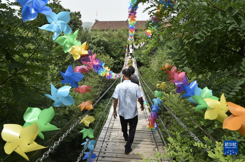 8月18日,游人在汝州市陵头镇王湾民俗村游览。