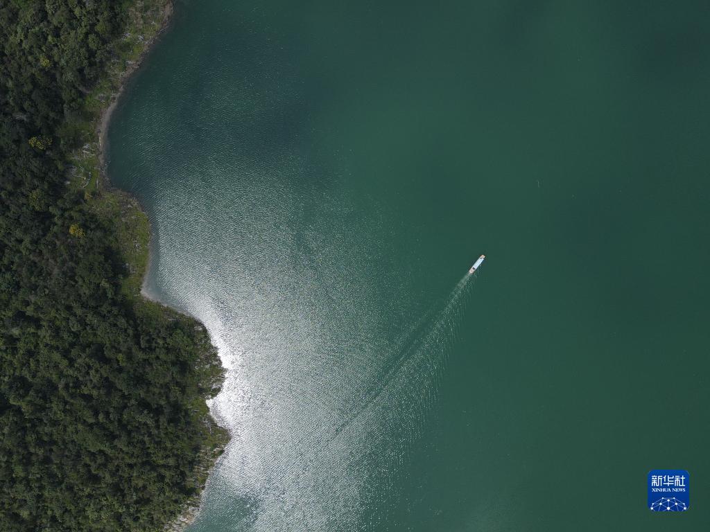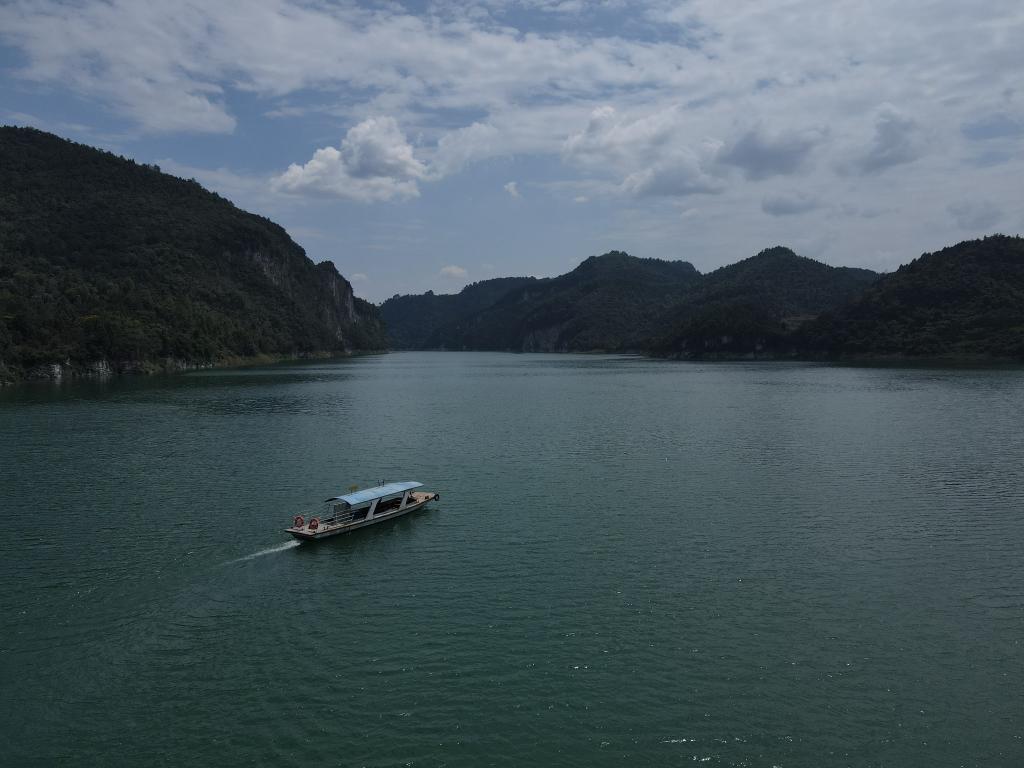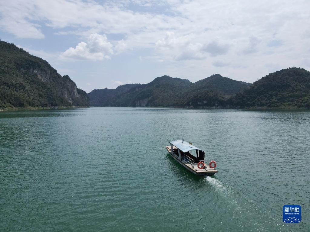 8月18日,贵州省遵义市余庆县花山苗族乡万里村村民宋梅麦驾驶渡船行驶在乌江上(无人机照片)。新华社记者 郑明鸿 摄