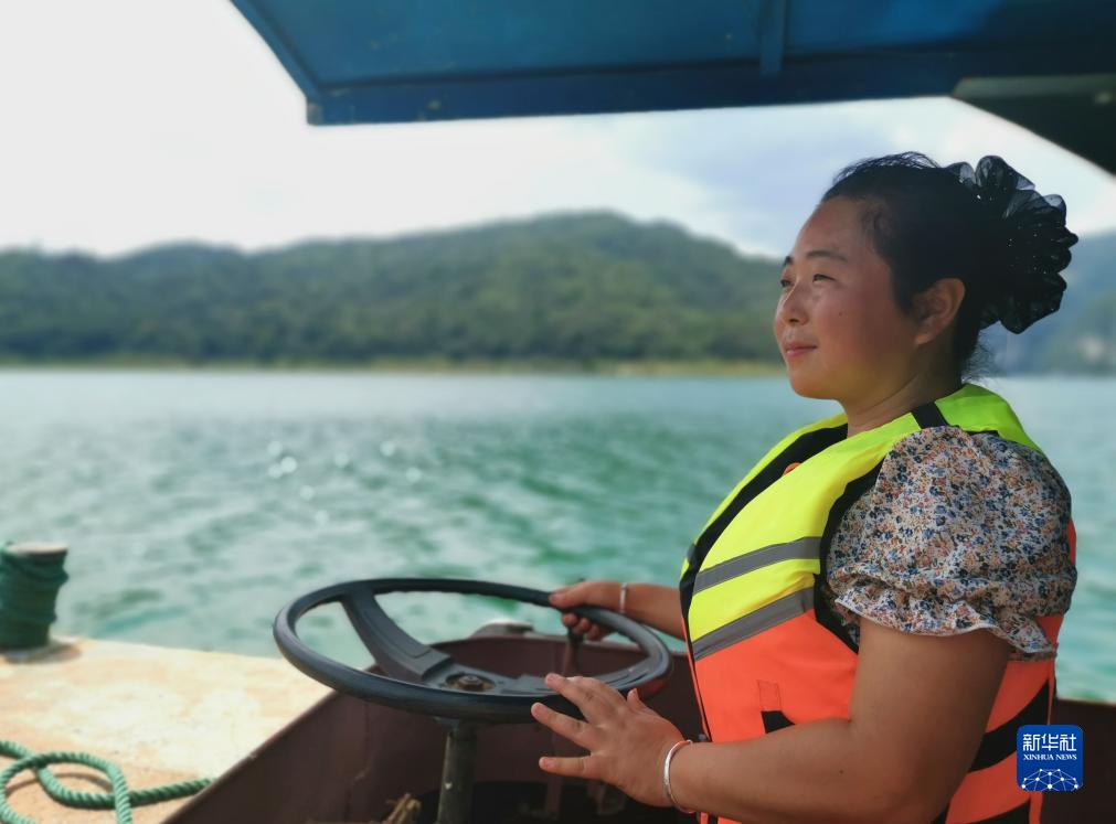 8月18日,贵州省遵义市余庆县花山苗族乡万里村村民宋梅麦在驾驶渡船。新华社记者 杨欣 摄