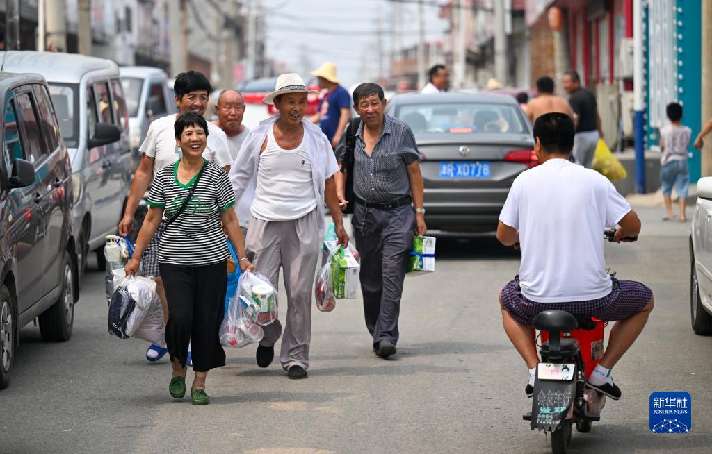 8月20日,在天津市静海区台头镇,返村村民在街上相互问候。