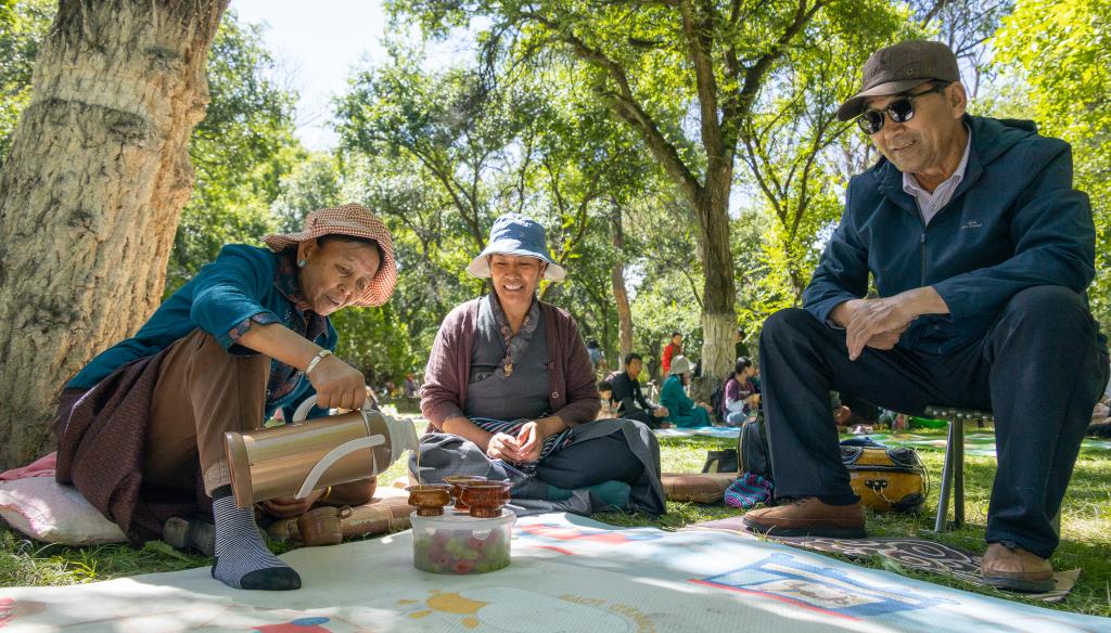 闲适的午后,曲乐悠扬,62岁的念扎和家人其乐融融地坐在树荫下“过林卡”。“以前大家只有雪顿节会出来享受林卡时光,而现在随着交通便利,能去的地方越来越多,‘过林卡’已经成为我们度过周末的常见选择。”聊到“过林卡”的变化,念扎说,“过去雪顿节上的酸奶都是用木碗、瓷碗盛装,现在雪顿节的酸奶有各种各样的精美包装,我们有更多选择。”