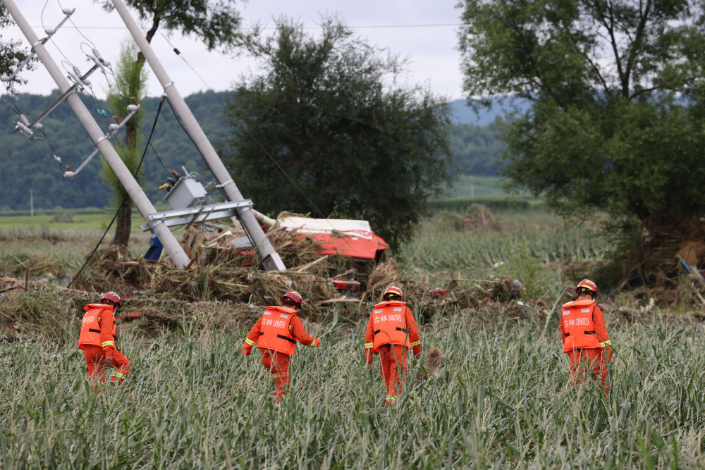 8月6日,吉林省吉林市消防救援支队的消防救援人员在舒兰市开原镇受灾村庄进行搜救。新华社记者 颜麟蕴 摄