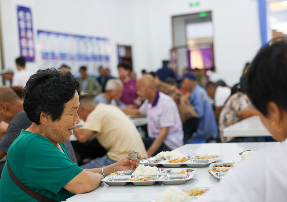 8月11日,居民在吉林省舒兰市舒兰三中安置点的食堂吃饭。新华社记者 颜麟蕴 摄