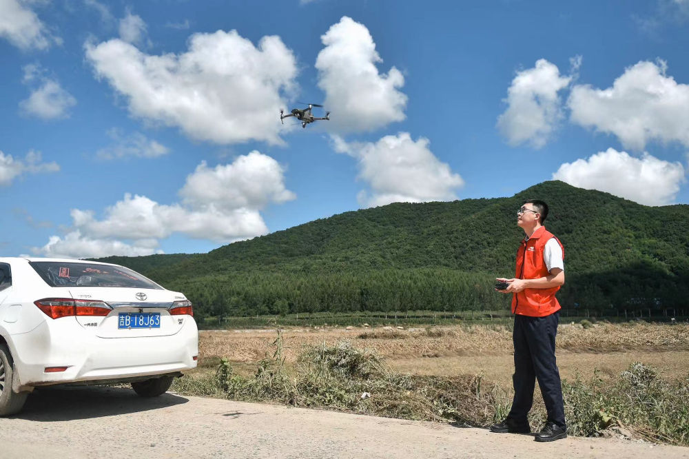 农业保险理赔人员使用无人机查看吉林省舒兰市金马镇周边农田受灾情况(8月15日摄)。新华社记者 许畅 摄
