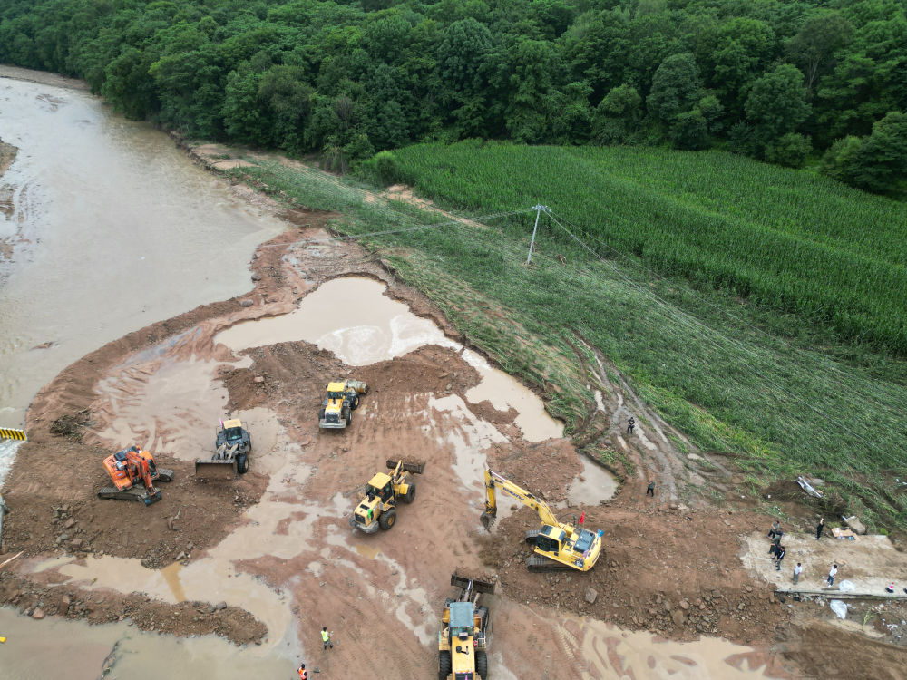 8月7日拍摄的吉林省舒兰市开原镇青松林场附近的道路抢修现场。新华社记者 颜麟蕴 摄