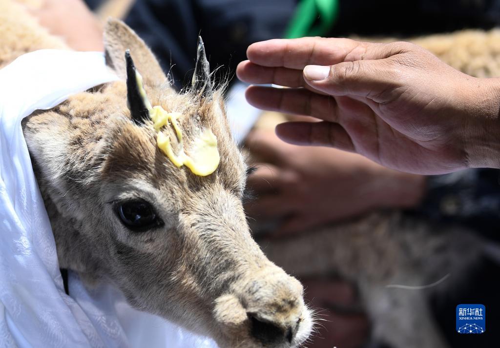 2021年7月7日,在可可西里索南达杰保护站野生动物救助中心,三公两母共五只人工救助的藏羚羊被放归大自然。可可西里巡山队员按照风俗,在藏羚羊额头上涂抹酥油表达祝福。新华社记者 张龙 摄