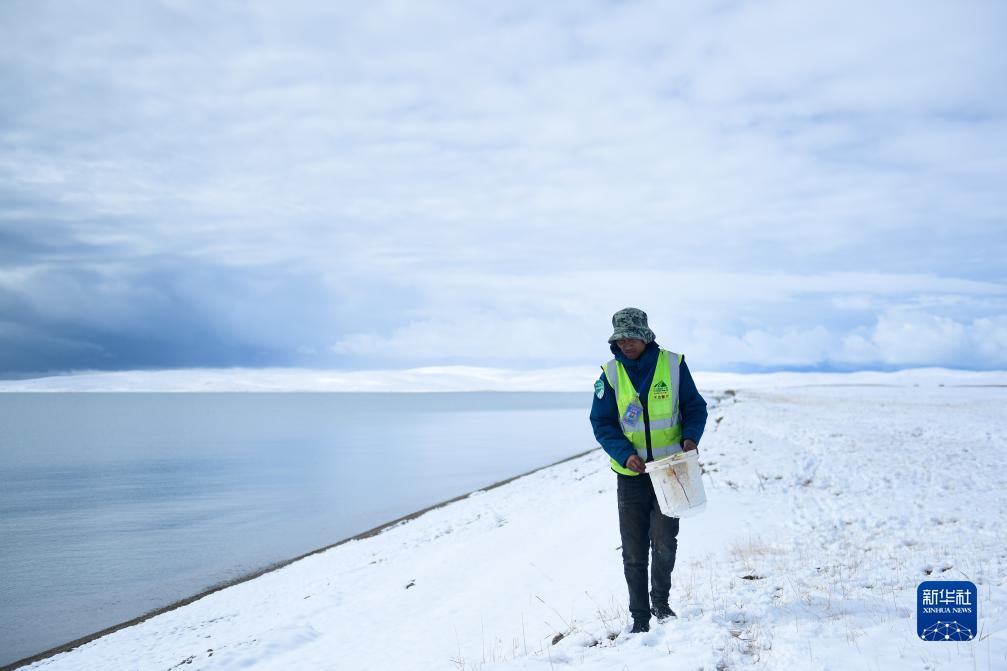 2021年10月20日,在青海省果洛藏族自治州玛多县扎陵湖乡勒那村,三江源国家公园黄河源园区生态管护员俄措在扎陵湖边捡拾垃圾。新华社记者 张龙 摄