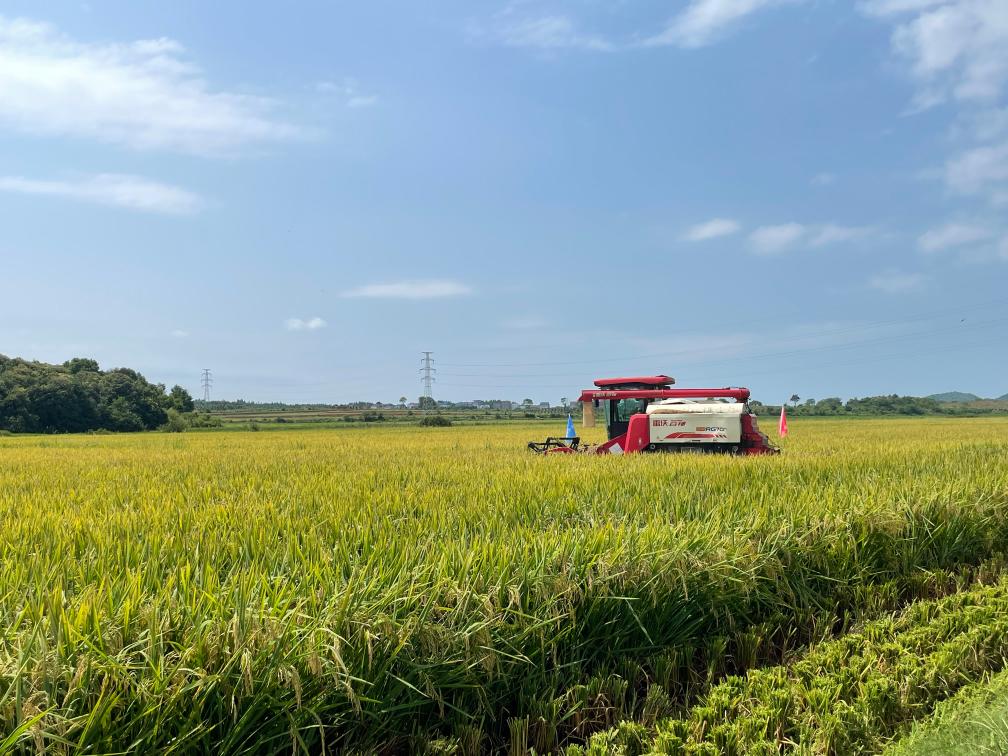 在江西省鄱阳县再生稻高产示范片, 收割机正在收割水稻。新华社记者 郭杰文 摄