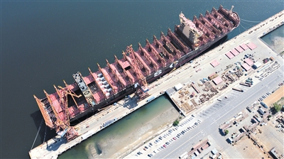 这是中船(天津)船舶制造有限公司厂区一艘已经下水准备交付的船舶(无人机照片)。记者 赵子硕 摄