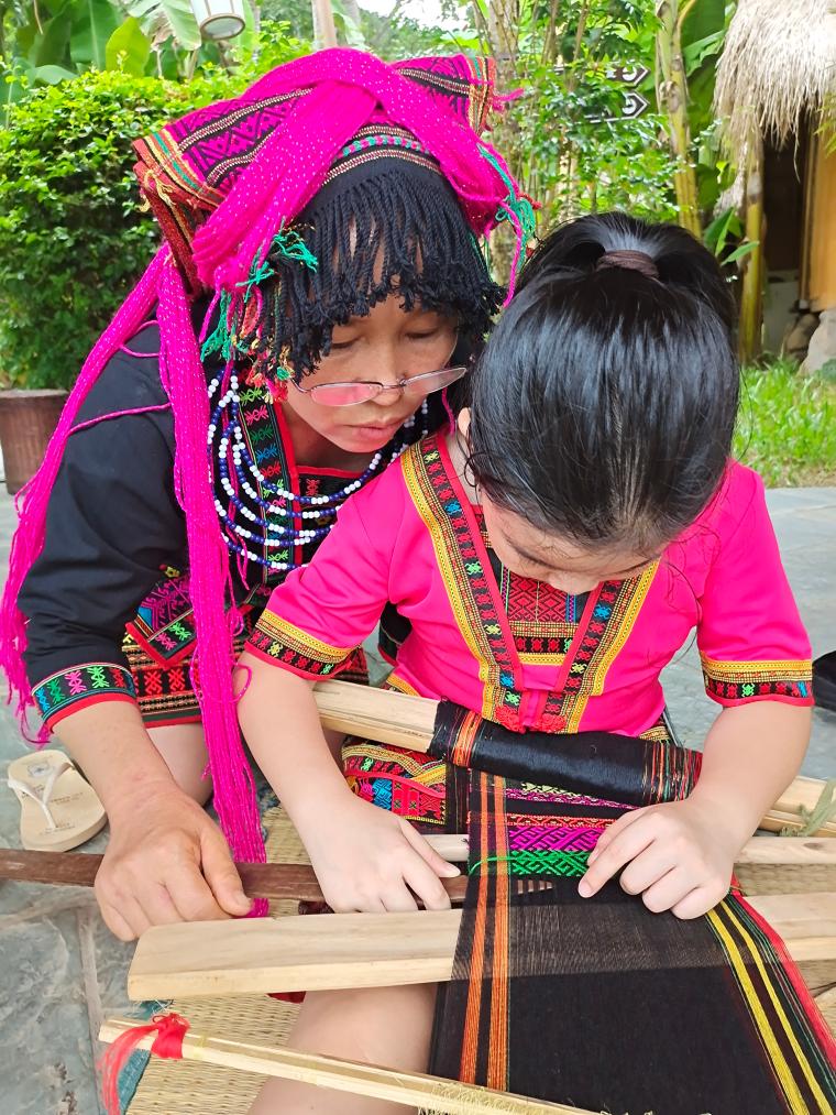8月19日,小朋友在海南省昌江黎族自治县王下乡体验黎锦编织。(吕庆沼 摄)