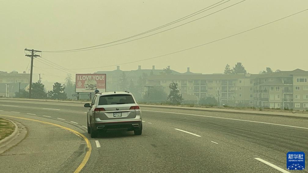 8月20日,在加拿大基洛纳,车辆在野火烟霾笼罩中的道路上行驶。