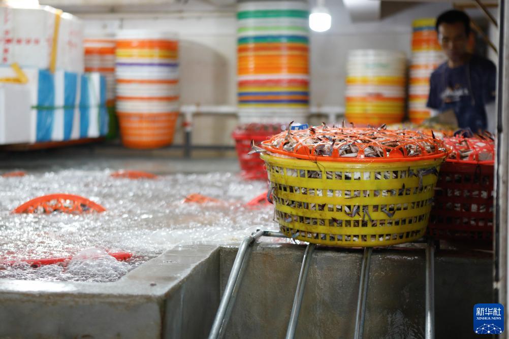 8月16日,工作人员将刚到港的梭子蟹转运至浙江省舟山市普陀区舟山国际水产城商户的暂养池。新华社记者 刘梦琪 摄