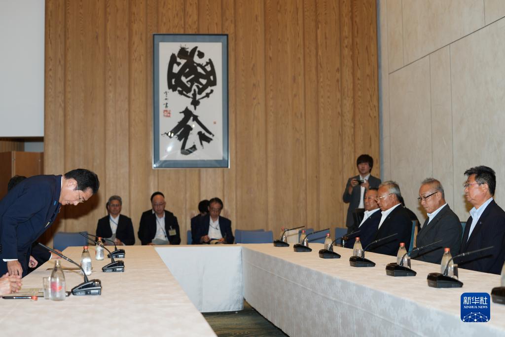 8月21日,在日本东京首相官邸,日本首相岸田文雄(左一)会见日本全国渔业协会联合会会长坂本雅信(右一)一行。新华社记者 张笑宇 摄