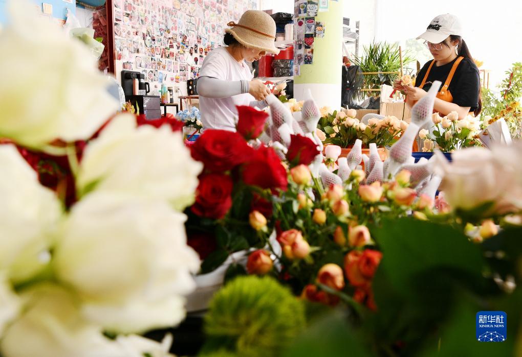 “七夕”将至,鲜花市场呈现俏销势头,不少商家精心准备花卉产品,吸引顾客前来购买。