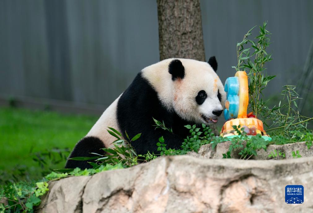 8月21日,大熊猫幼崽“小奇迹”在美国首都华盛顿史密森学会国家动物园享用生日蛋糕。华社记者 刘杰 摄