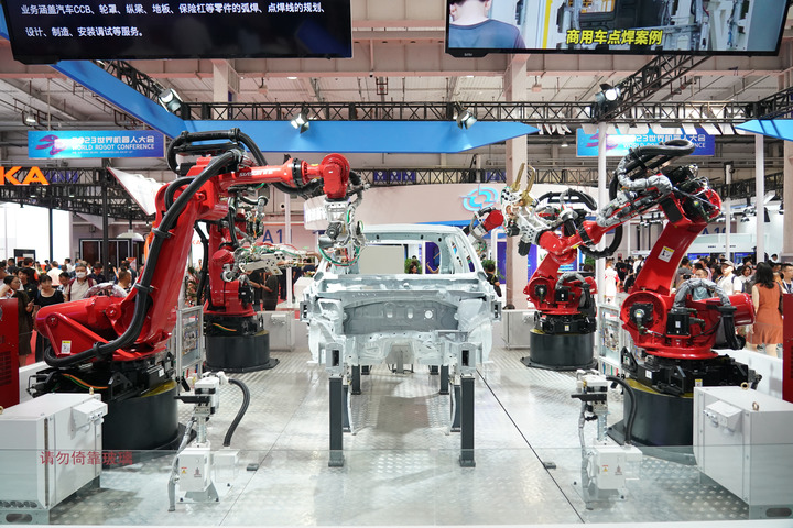 强劲灵活的手腕,高扭矩的设计,4个红色的机械臂上下挥舞,为汽车车身进行点焊作业……在2023世界机器人大会上,沈阳新松公司针对汽车工业研发的白车身点焊机器人工作站引人注目。