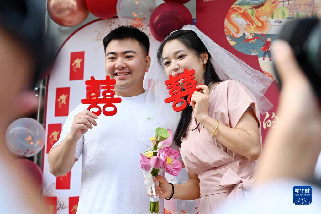 8月22日,一对新人在四川省内江市东兴区民政局婚姻登记处拍照留念。