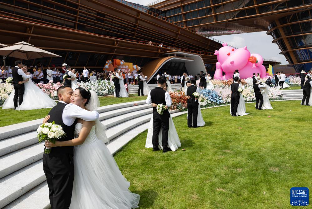当日是七夕,来自四川省宜宾市三江新区33对新人在三江新区“三江之眼”举办了“为爱奔赴·幸福三江”主题集体婚礼。