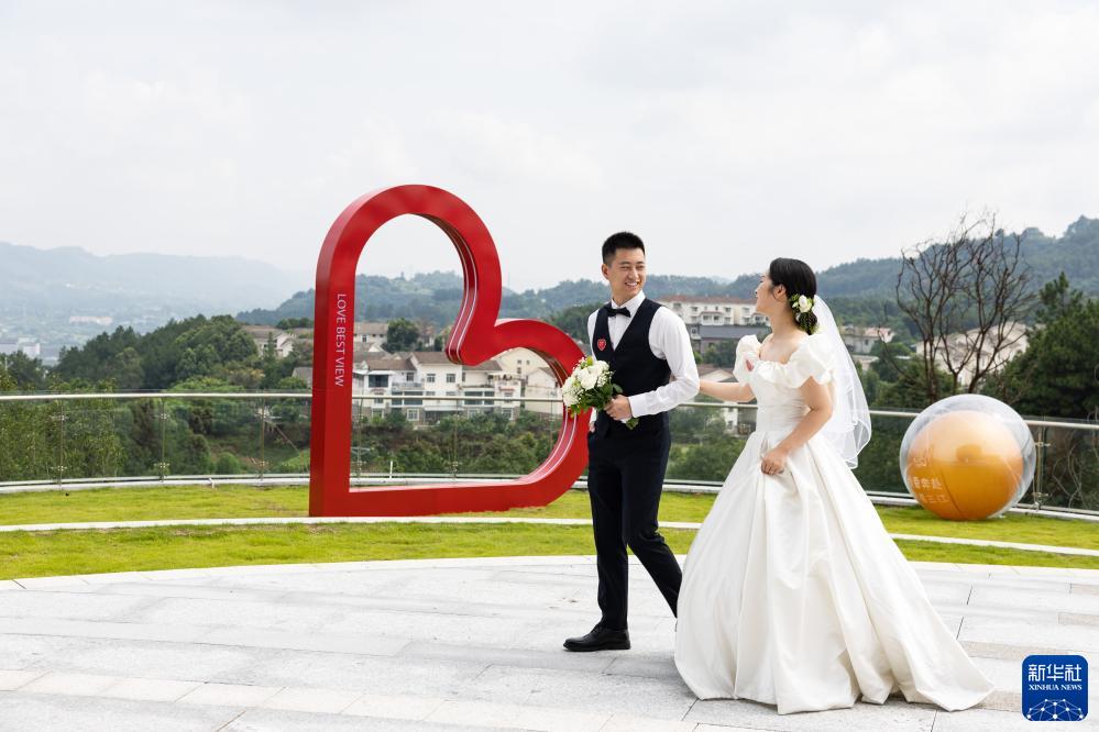 8月22日,一对参加集体婚礼的新人在三江新区“三江之眼”拍照留影。