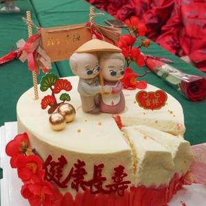 8月22日,在浙江省瑞安市湖岭镇综合文化站,工作人员为金婚夫妇送上蛋糕。