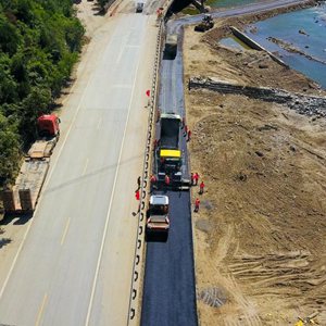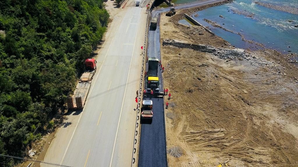 8月20日,在房山区涞宝路,施工队在为抢修出的临时便道路面铺设沥青。(房山公路分局供图)