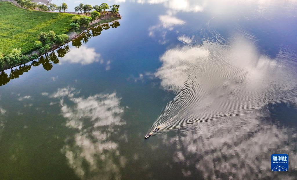 两条小船行驶在芦河河面上,宛如一幅壮丽的图画(8月18日摄,无人机照片)。