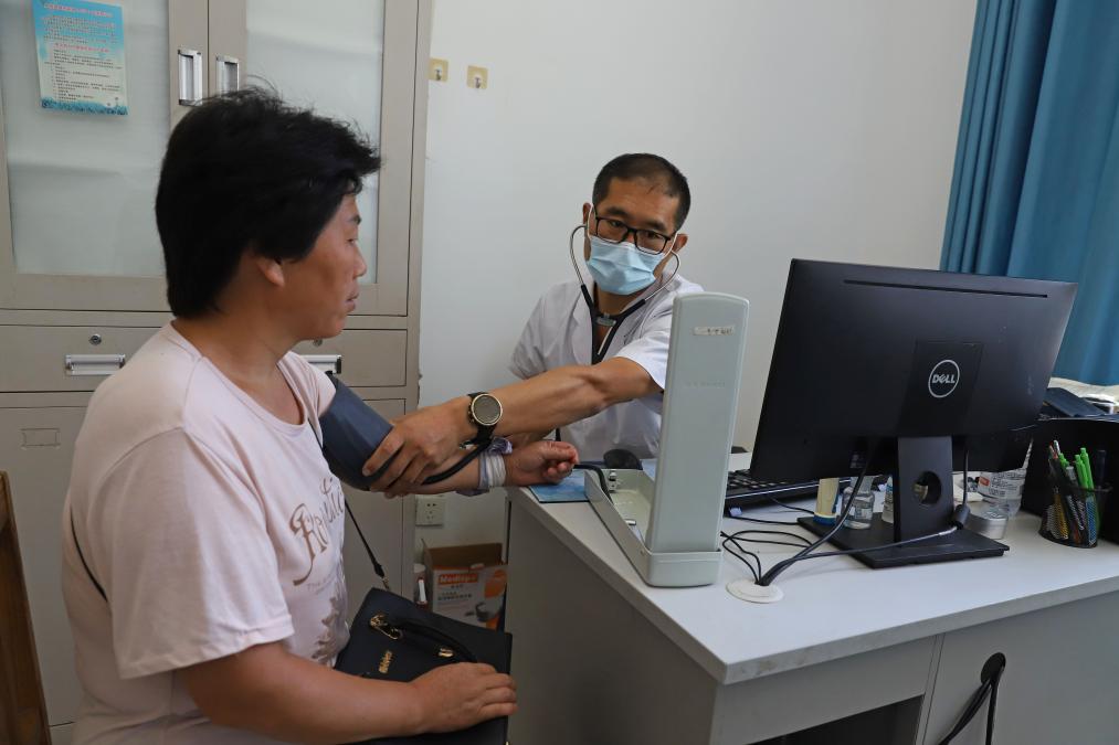 在涿州市码头镇中心卫生院,医护人员正在为前来就诊的村民测量血压。班静怡 摄
