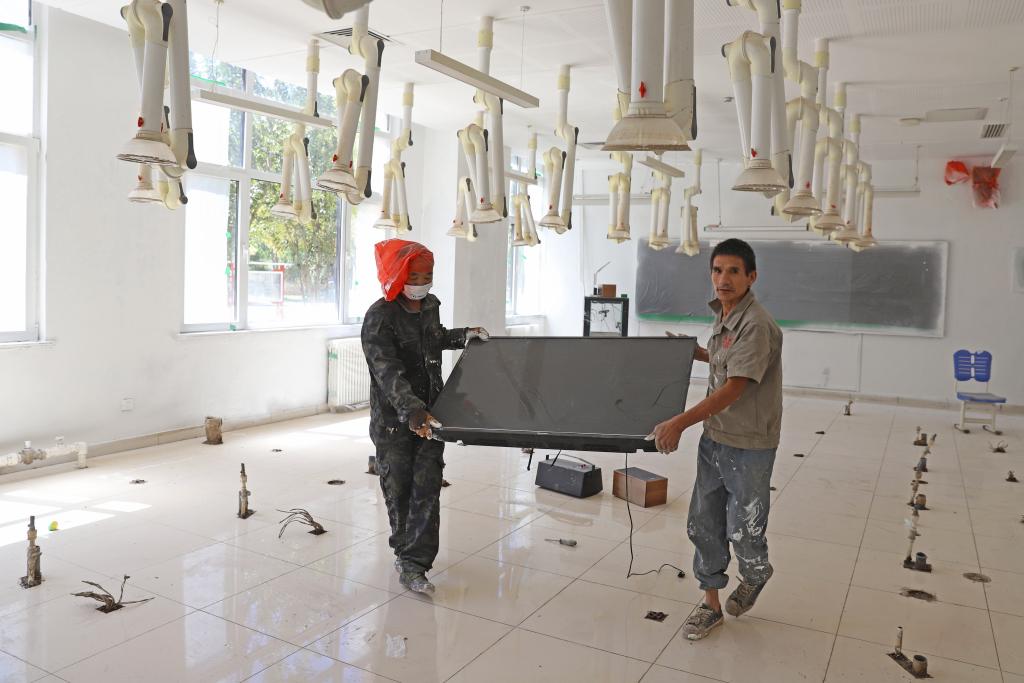 在涿州市高新区学校筑梦楼实验室内,工人们正在对受损墙面进行粉刷,经过多次消杀的干净桌椅摆放在室外晾晒。