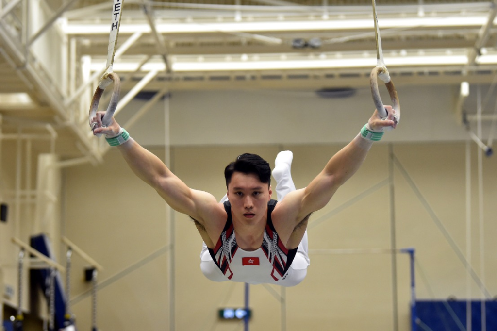 8月22日,中国香港体操运动员吴翘充在进行吊环训练。新华社记者卢炳辉摄
