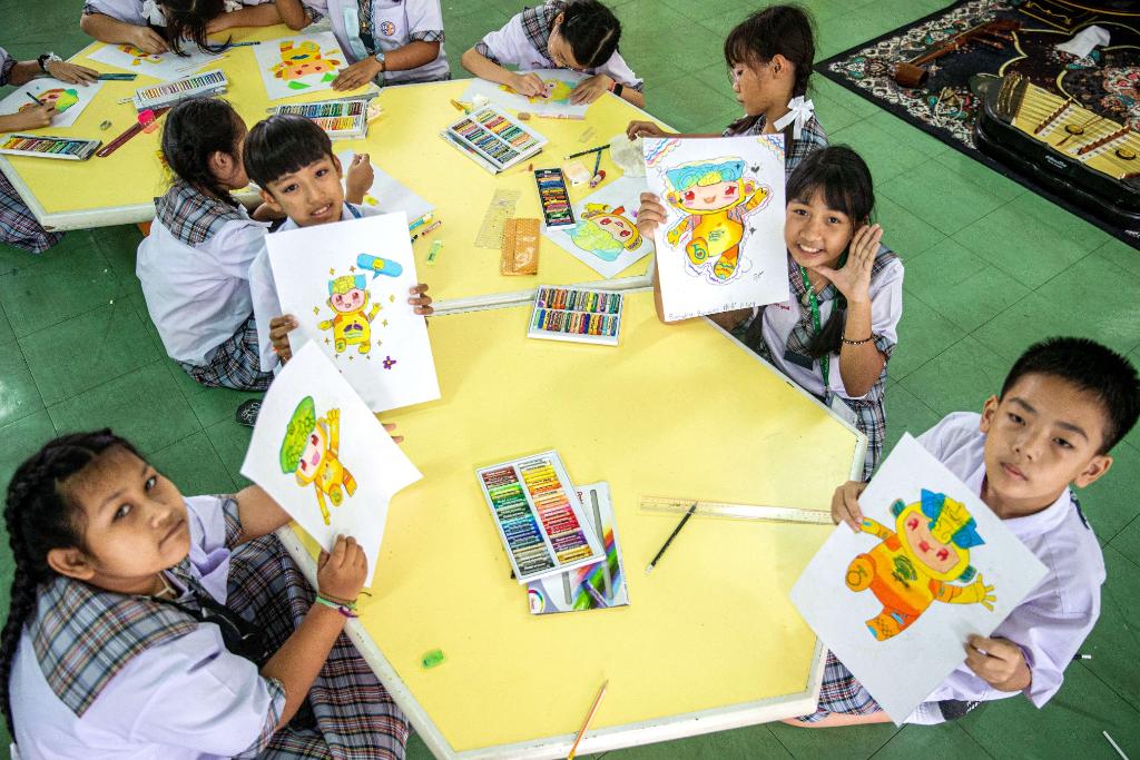 8月4日,泰国学生展示画完的杭州亚运会吉祥物。新华社记者王腾摄