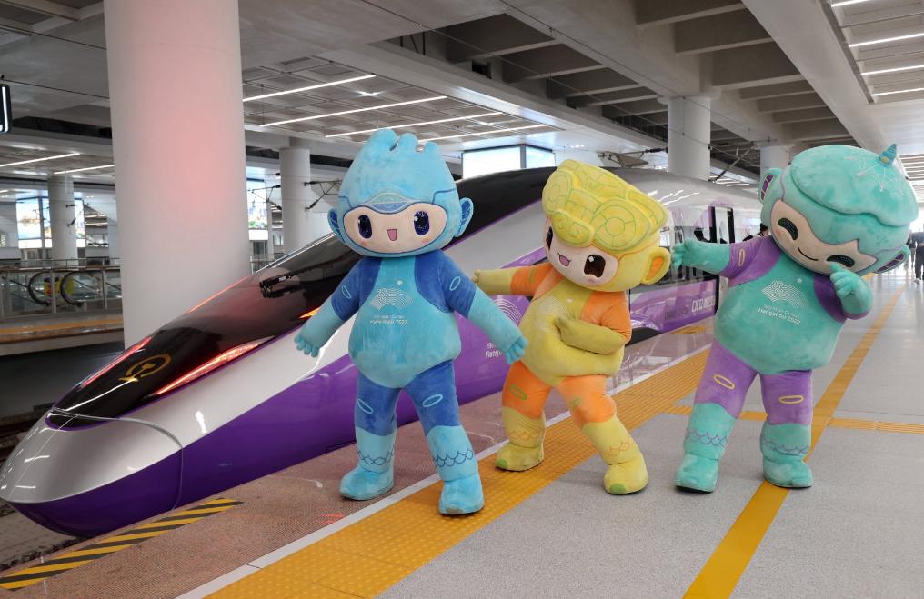 8月4日,在浙江省杭州西站,杭州亚运会吉祥物与复兴号亚运智能动车组列车合影留念。新华社发(谢尚国摄)