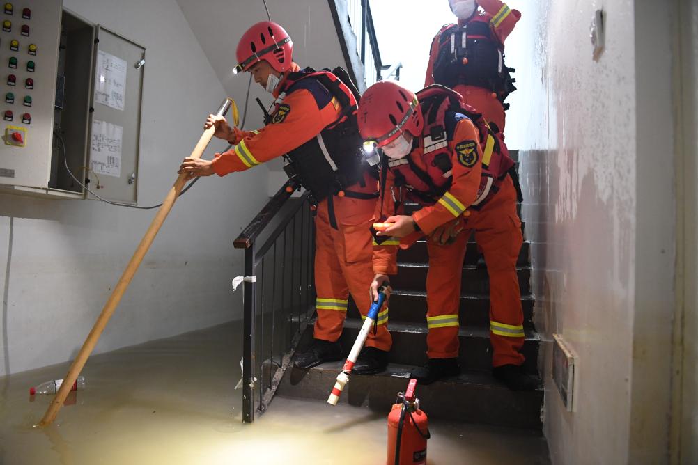 8月7日,邢台市消防救援支队队员在河北省涿州市万科城际之光写字楼B1地库清扫积水。