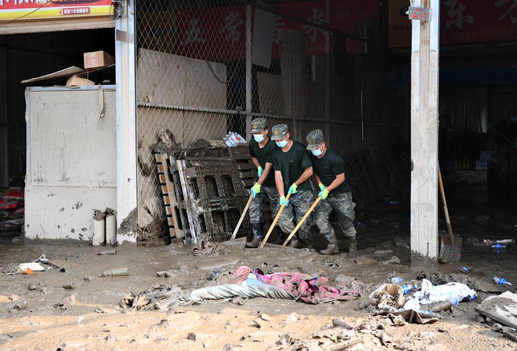 8月10日,在大石桥农副产品批发市场,武警战士和商户在清理垃圾和淤泥。