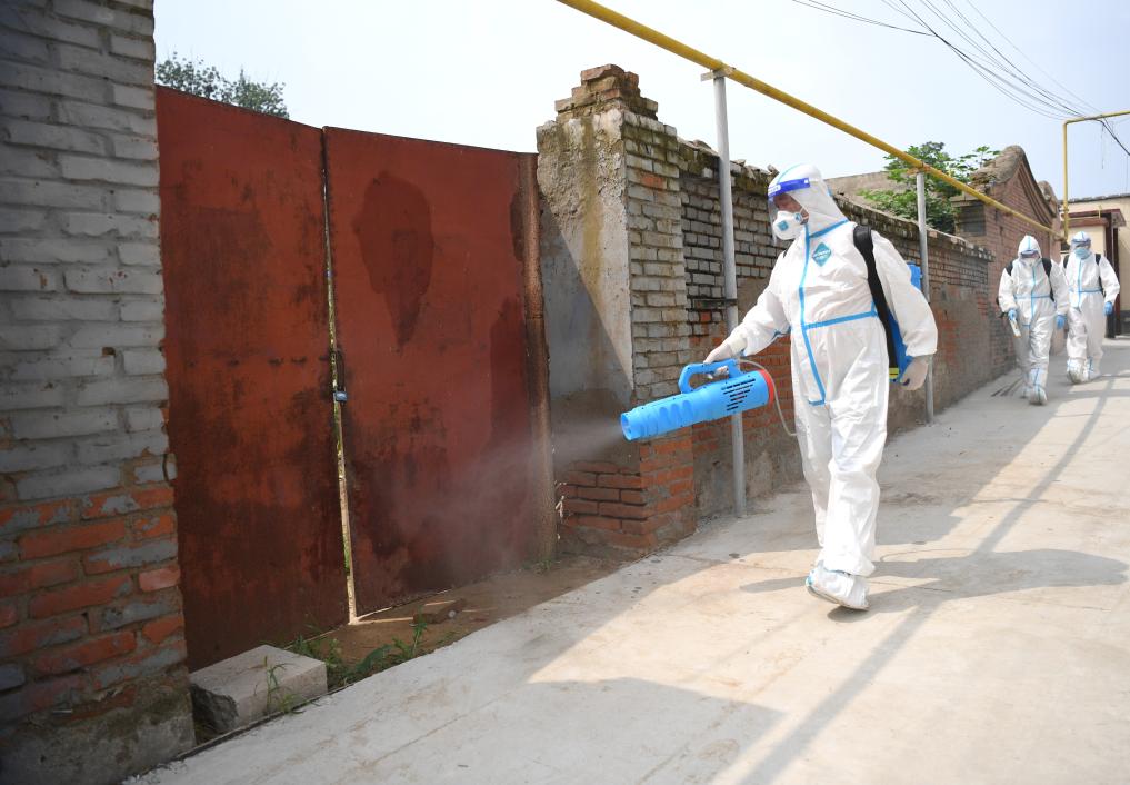 8月8日,来自山西的退役军人志愿者在涿州市桃园街道忠义店村开展消杀作业。