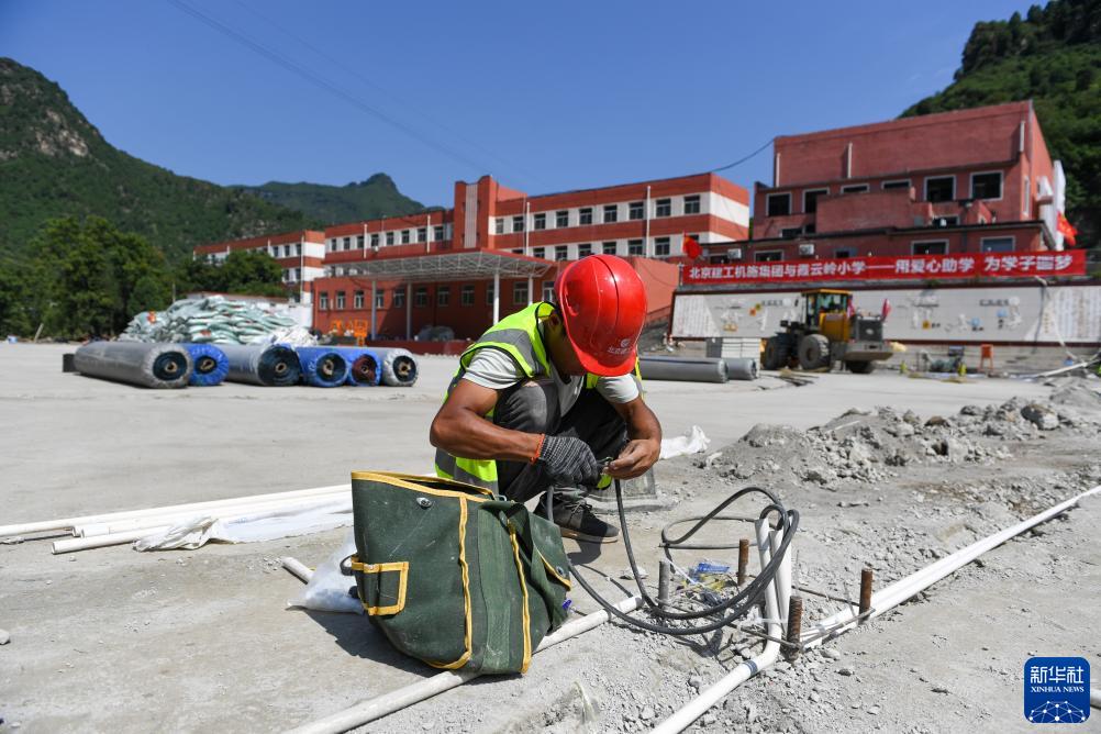 8月23日,在北京市房山区霞云岭中心小学,北京建工机施集团的施工人员在操场上检查铺设的电力线路。
