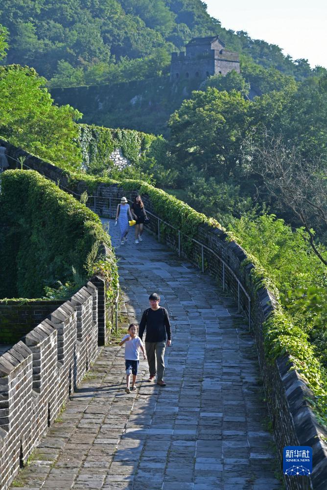 虎山位于辽宁省丹东市鸭绿江畔,夏日,在植被映衬下,长城蜿蜒多姿,壮美秀丽,吸引游客前来参观游览。