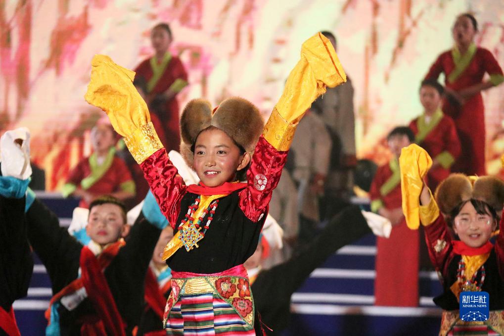 来自西藏山南市贡嘎县的小学生在表演藏族传统舞蹈(8月23日摄)。