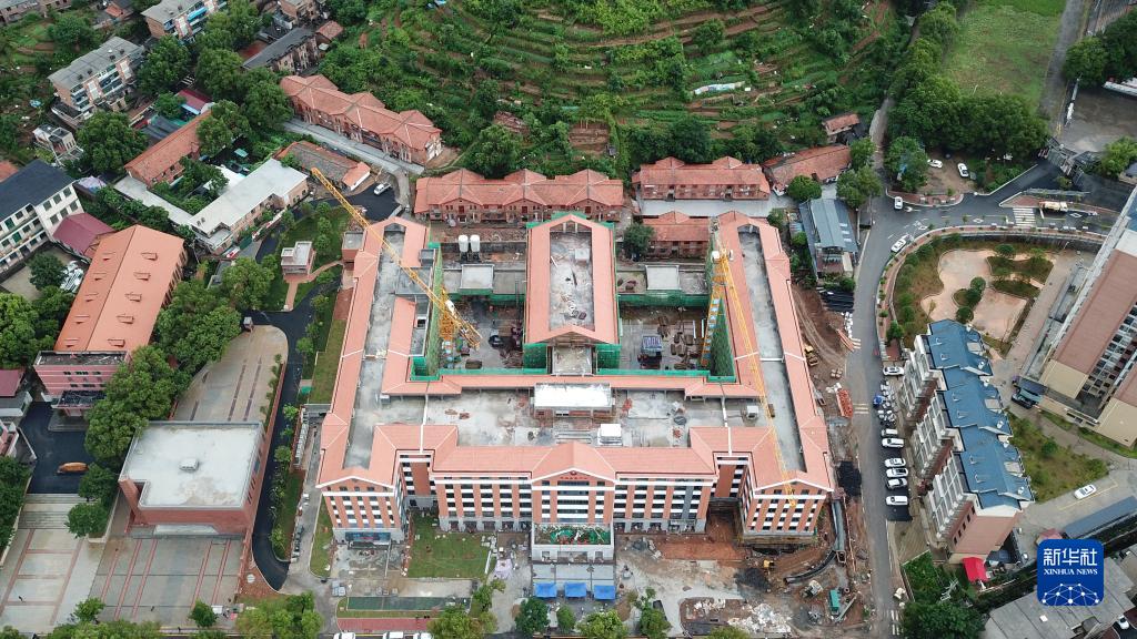 8月22日,在湖南省郴州市苏仙区许家洞镇七一一矿区,一座大型医养中心正在修建中(无人机照片)。新华社记者 陈振海 摄
