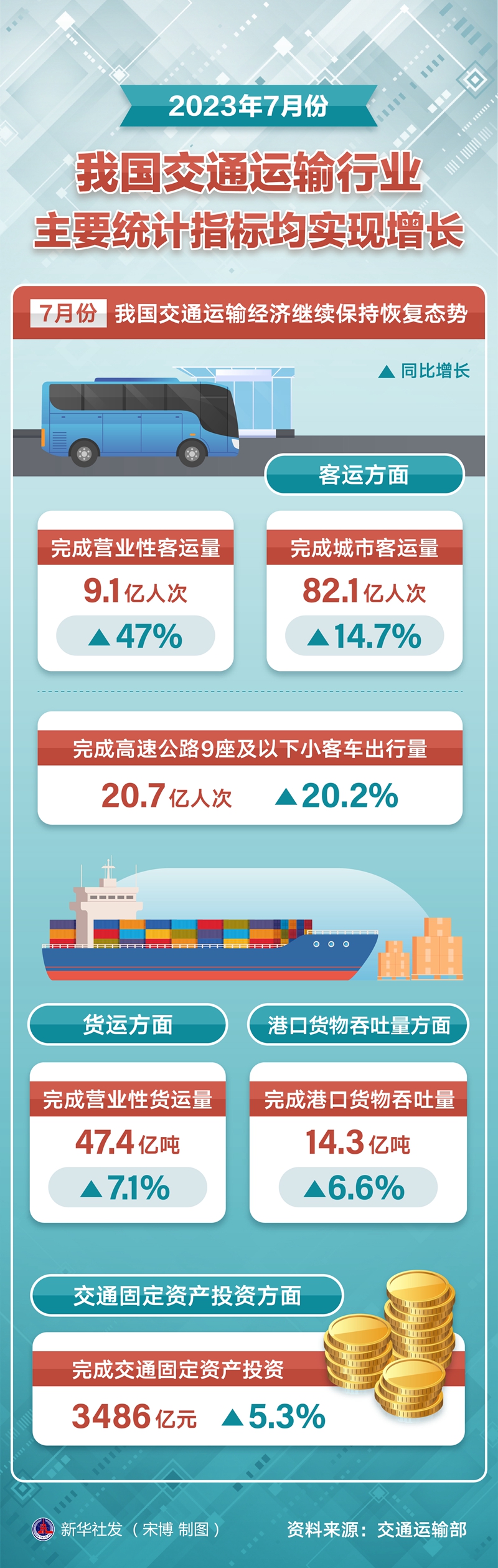 客运方面,7月份,完成营业性客运量9.1亿人次,同比增长47%;完成城市客运量82.1亿人次,同比增长14.7%;完成高速公路9座及以下小客车出行量20.7亿人次,同比增长20.2%。