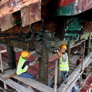8月24日,施工人员在河北正定古城南城门楼施工现场进行修缮作业。