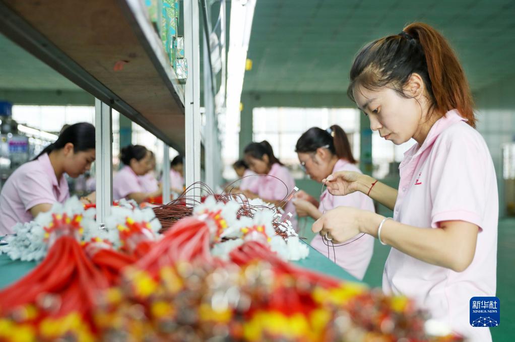 8月24日,四川省广安华蓥山经开区一家电子企业的线束车间,员工在流水线上作业。
